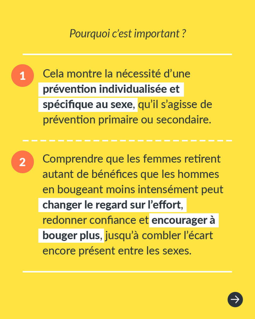 👉 Les femmes obtiennent le même bénéfice santé en deux fois moins de temps d’effort.