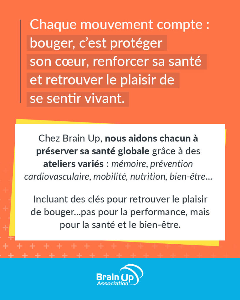 Chez Brain Up, nous croyons à la prévention accessible à tous, à travers des actions concrètes et bienveillantes pour retrouver le plaisir de bouger…pas pour la performance, mais pour la santé et le bien-être.